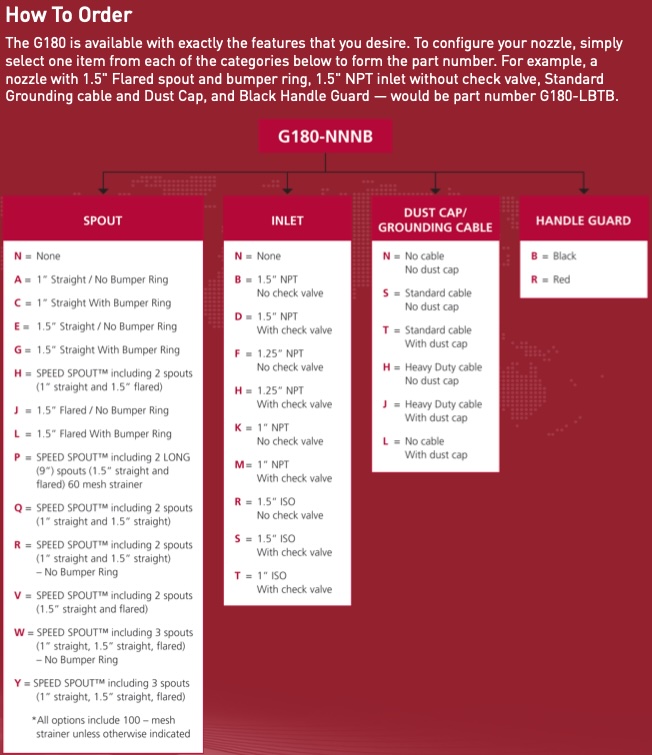 The G180 nozzle has been designed and developed for overwing fueling of both commercial and military aircraft. Lightweight, comfortable and easy to operate, this product has a wide range of applications across the aviation sector. Alongside the standard G180 is EMCO Wheaton’s speed spout option. This variant allows operators to change spouts in less than five seconds, making it ideal for time-sensitive operation.